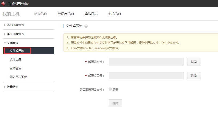 使用主机管理账号密码,登陆主机管理控制台,选择其中的“文件管理”—>“文件解压缩”,按照提示操作。