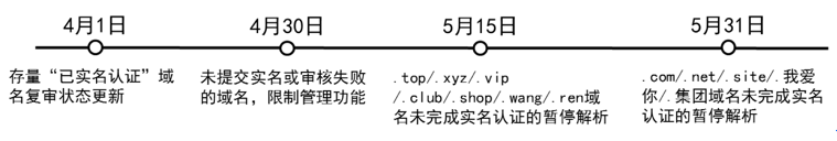 3、为了配合尽快完成实名认证审核工作, 自2017年4月30日起,如果您的域名属于上述域名后缀,仍未提交实名认证或审核失败的域名,其管理功能将受到限制,届时您将不能进行新增&修改解析、DNS修改及其他相关等操作。通过实名认证后,上述限制解除。